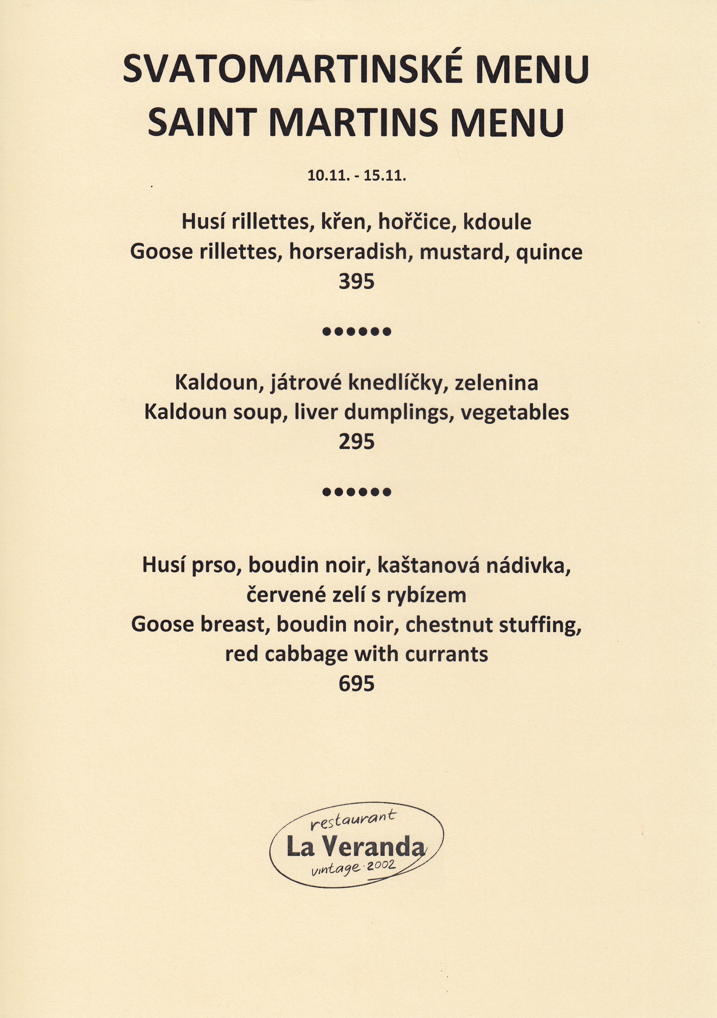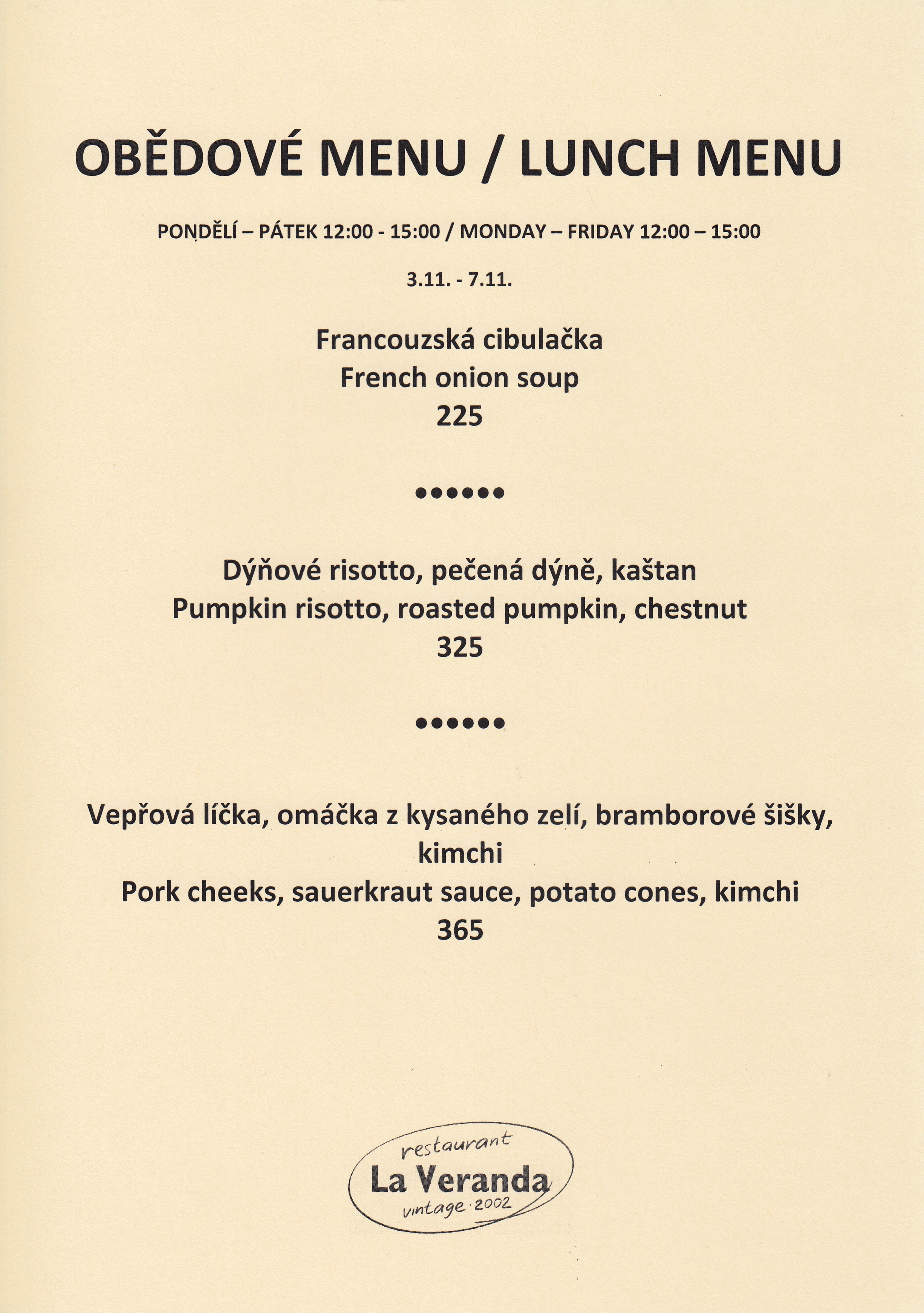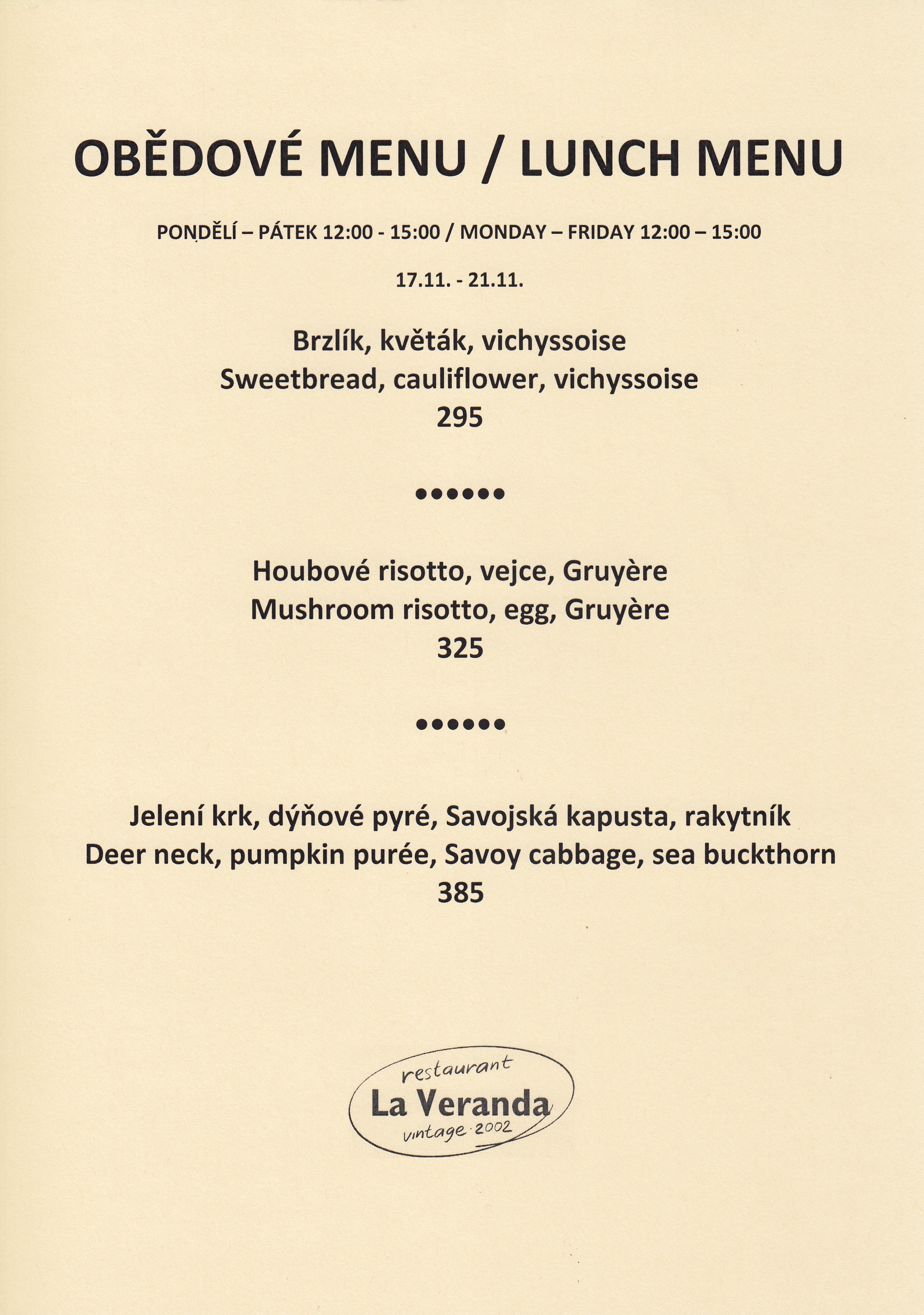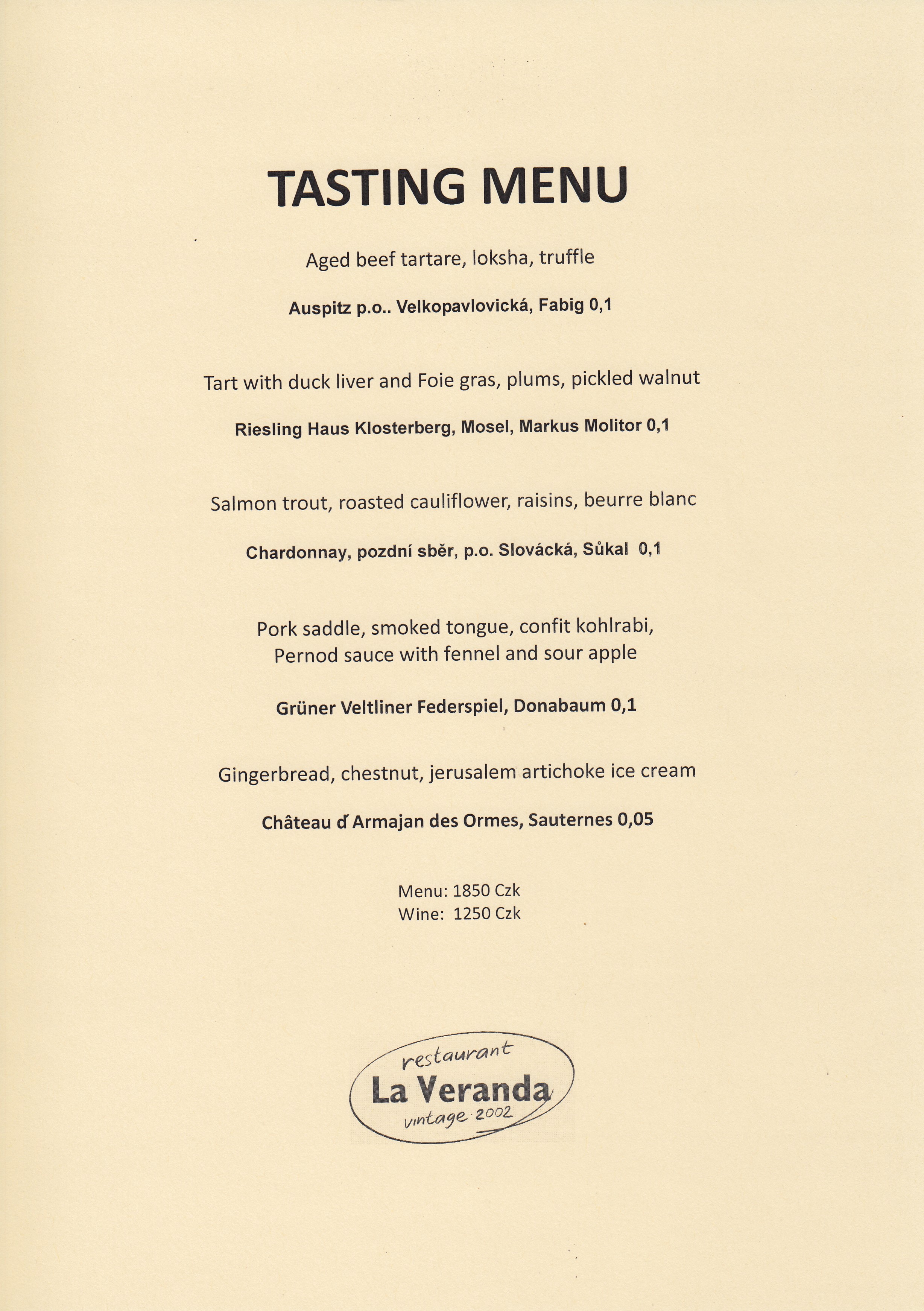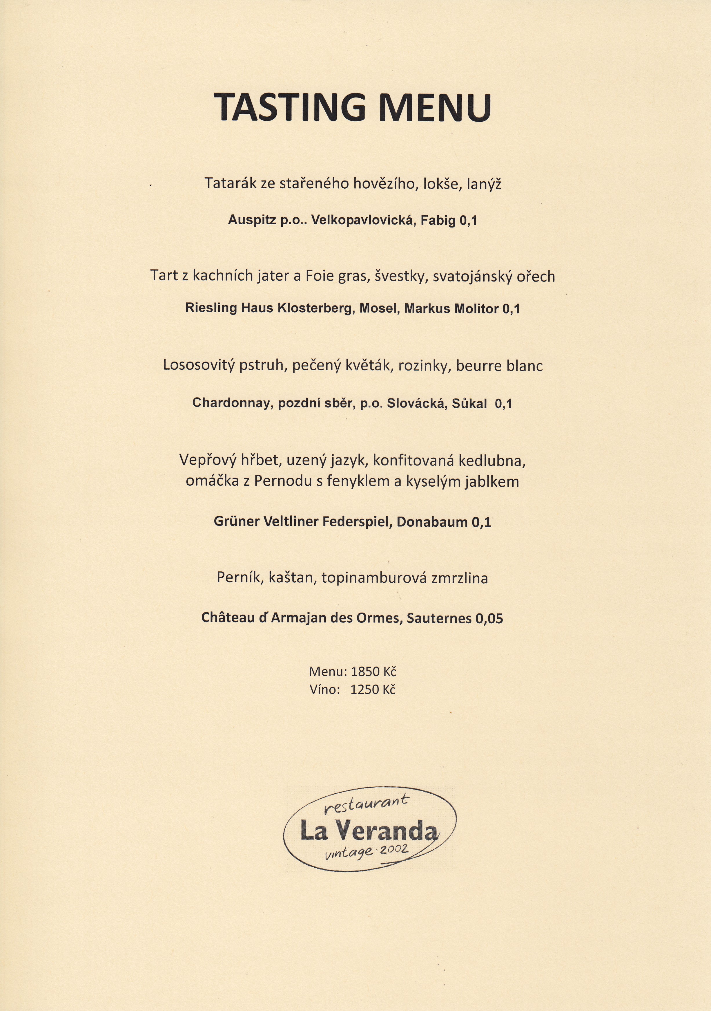 "Ve světě, v Evropě, v republice, v Praze, ba i na ulici mohou řádit všelijaké krize, ale v La Verandě u jejích stolů, tam je svět ještě stále v naprostém pořádku: vynikající jídlo, skvělé víno a obsluha, co si hosta nejen váží, ale doslova hýčká. Najíst a napít se v La Verandě je potěšení smyslů a balzám na duši. "