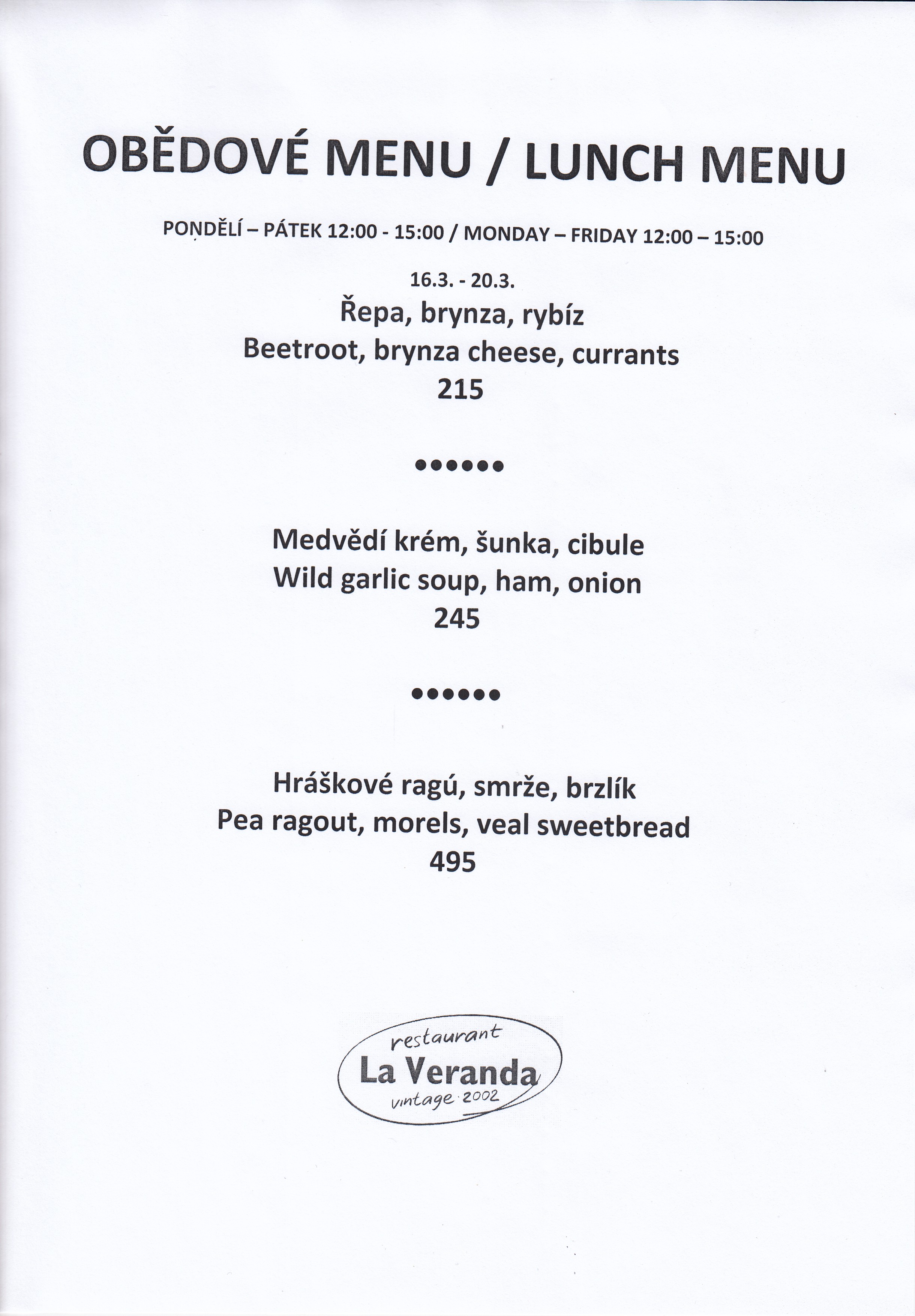 "Ve světě, v Evropě, v republice, v Praze, ba i na ulici mohou řádit všelijaké krize, ale v La Verandě u jejích stolů, tam je svět ještě stále v naprostém pořádku: vynikající jídlo, skvělé víno a obsluha, co si hosta nejen váží, ale doslova hýčká. Najíst a napít se v La Verandě je potěšení smyslů a balzám na duši. "