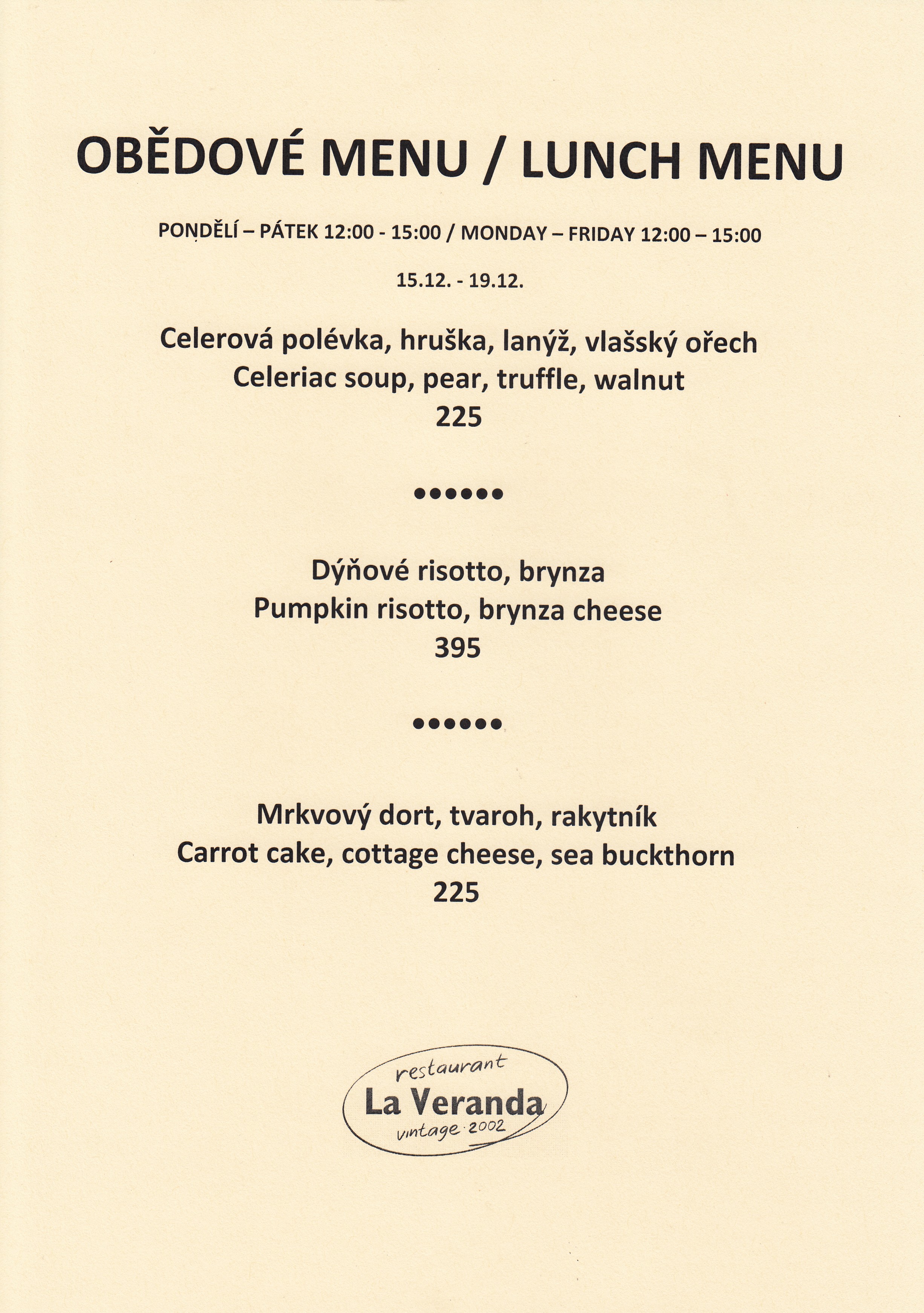 "Ve světě, v Evropě, v republice, v Praze, ba i na ulici mohou řádit všelijaké krize, ale v La Verandě u jejích stolů, tam je svět ještě stále v naprostém pořádku: vynikající jídlo, skvělé víno a obsluha, co si hosta nejen váží, ale doslova hýčká. Najíst a napít se v La Verandě je potěšení smyslů a balzám na duši. "